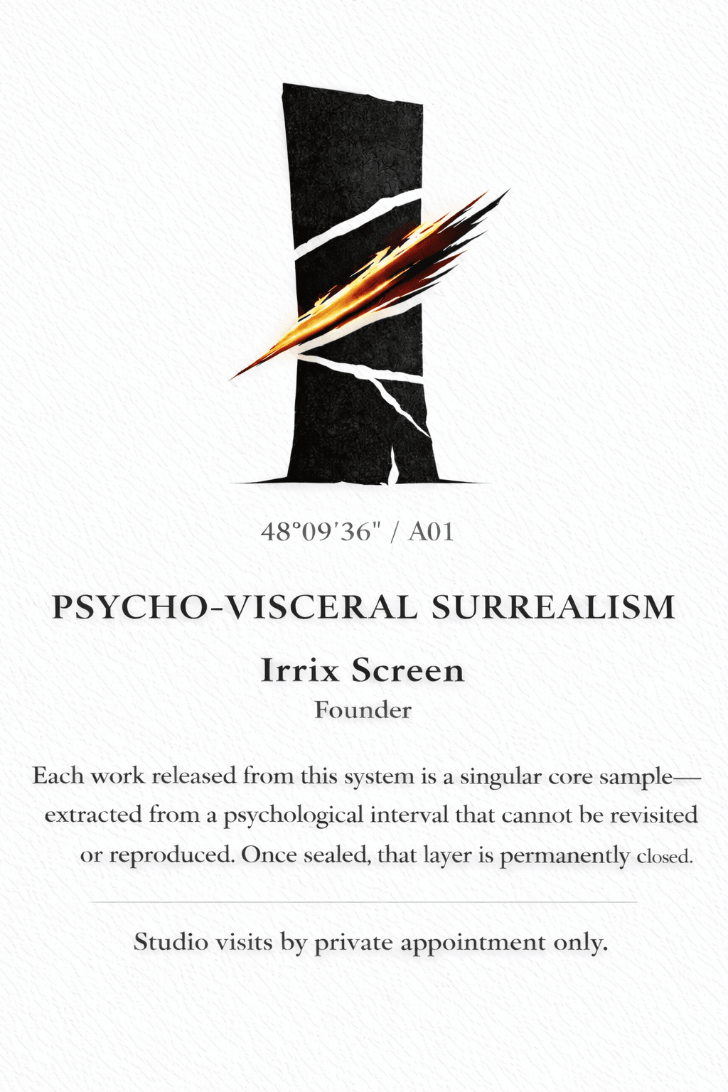 Irrix Screen operates within a self-contained artistic system grounded in psychological excavation and permanence. Each work is treated as a singular extraction — a fixed interval of thought, tension, and memory — released once and never revisited.